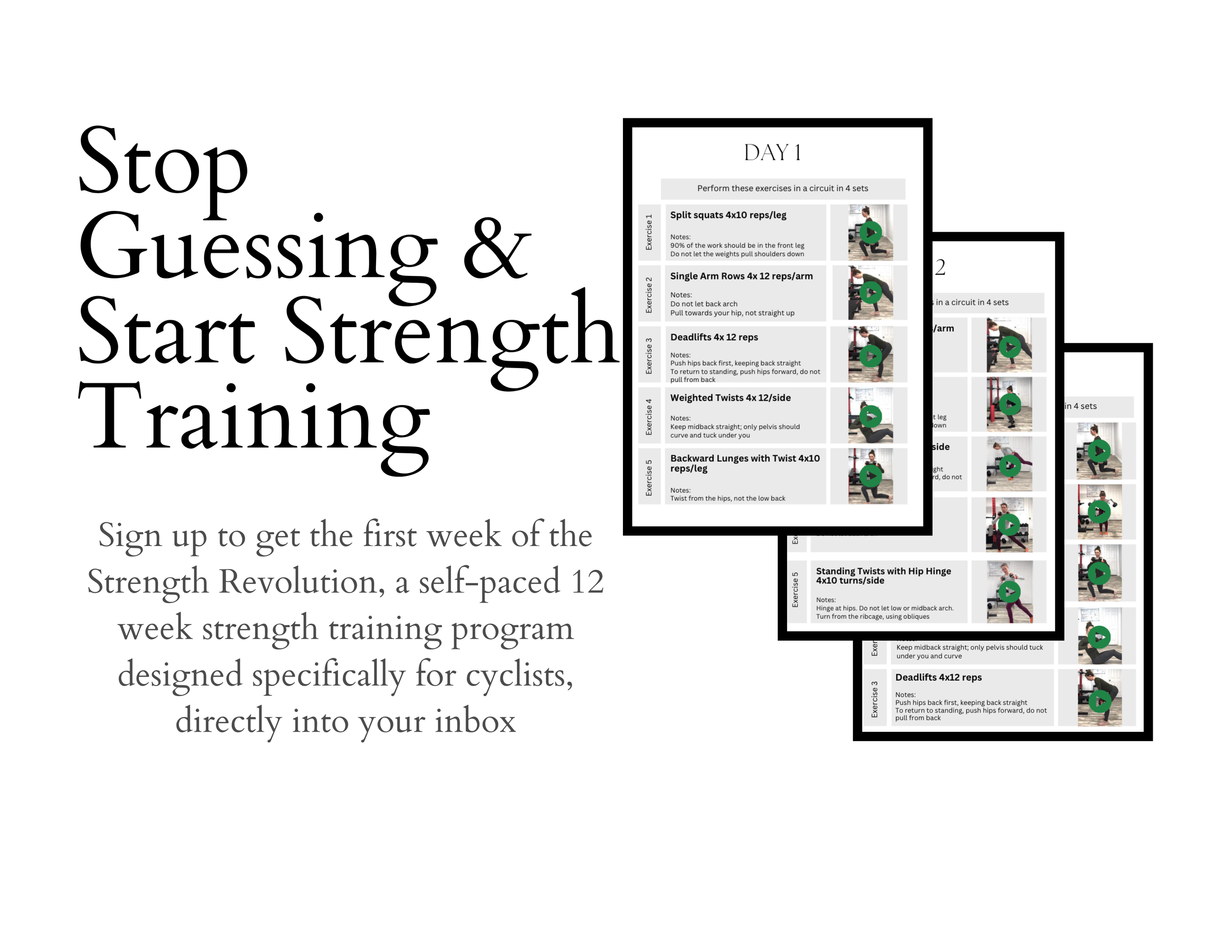 As a physical therapist, bike fitter, and cyclist I know how important strength training is to improve performance and make you as robust an athlete and human you can be. That’s why I created the Strength Revolution, a 12-week self-paced strength training program designed specifically for cyclists who want the guidance and knowledge on how to be efficient and effective in the gym. It provides everything you need to become a stronger rider, without wasting your time with anything you don’t. Click below👇 to get started!